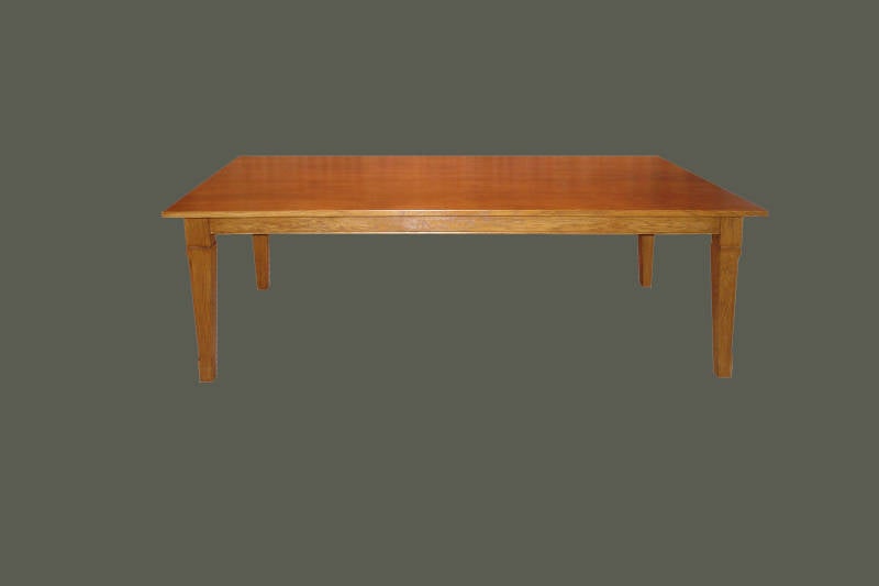 Tafelblad 4 c/m dik met aan de onderzijde afgeschuinde zijden. Regels voorzien van kraal. Poten tweezijdig tapstoelopend aan de binnenzijden; boven rondom voorzien van holprofiel. Buitenste ribbe voorzien van een 45o vlak, met hierin twee evenwijdig lopende gleuven. Tafelblad ondersteund dmv 2 eiken balken en in het midden door één dwarsregel mbv glijdende zwaluwstaart aan langsregels verbonden. Tafel afgewerkt met drie lagen Rambo interieurlak rustiek eiken.