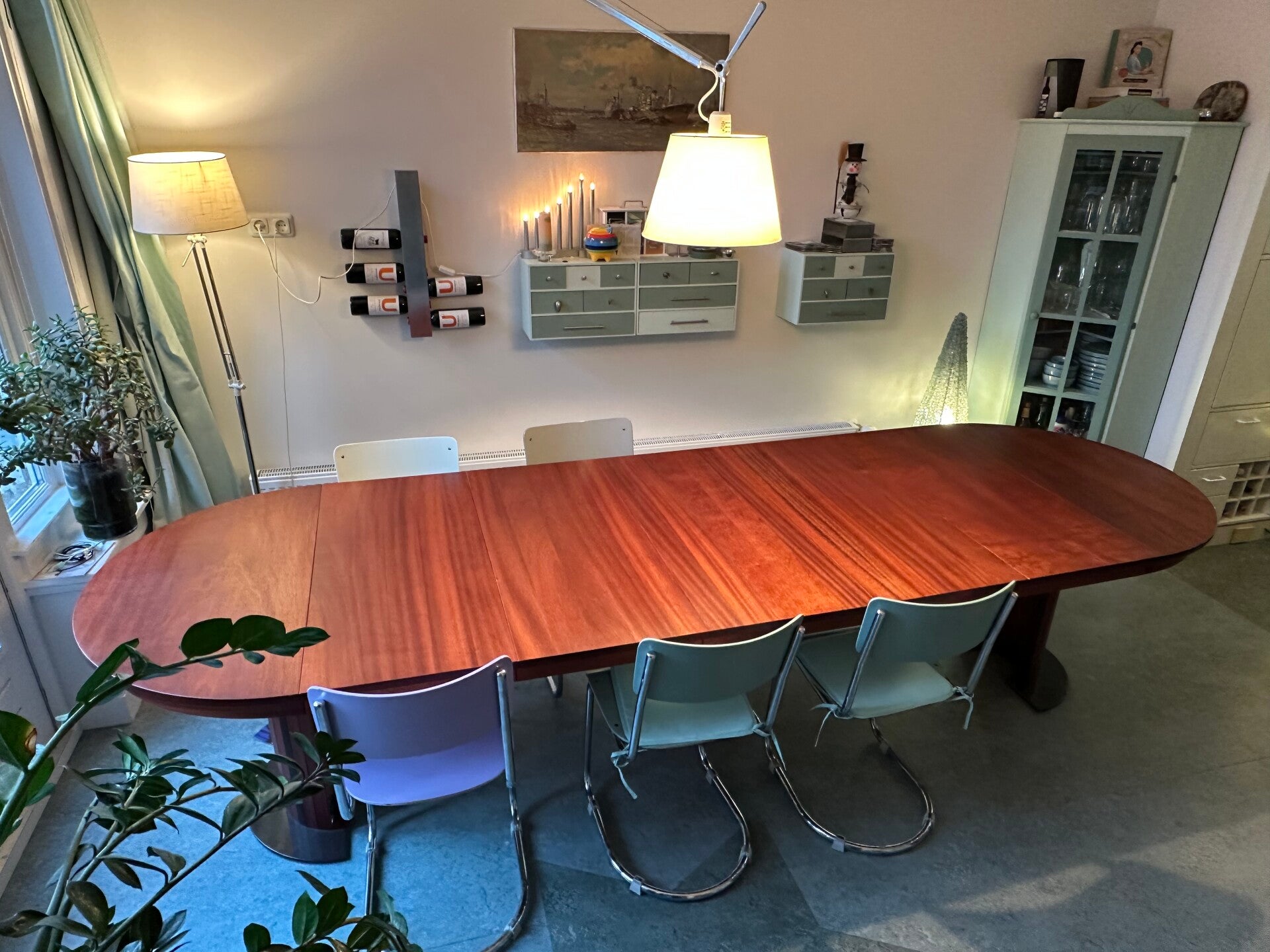December 2024. Uittrektafel Karin, mahonie, 105- 105-327,5 cm.