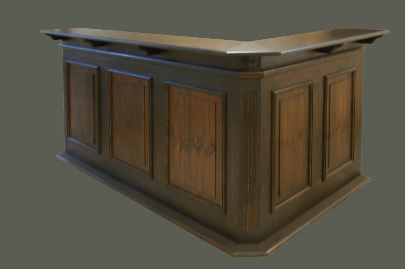Op maat gemaakte bar aan de hand van voorbeelden die de klant aanbracht. De bar is rijk versierd met panelen en profiel op blad en onderlijst. Ook de omranding van de panelen is met dezelfde profilering afgewerkt. Het blad wordt ondersteund met geprofileerde klossen. Het geheel is donkerbruin gebeitst en met twee lagen hardwaxolie behandeld.